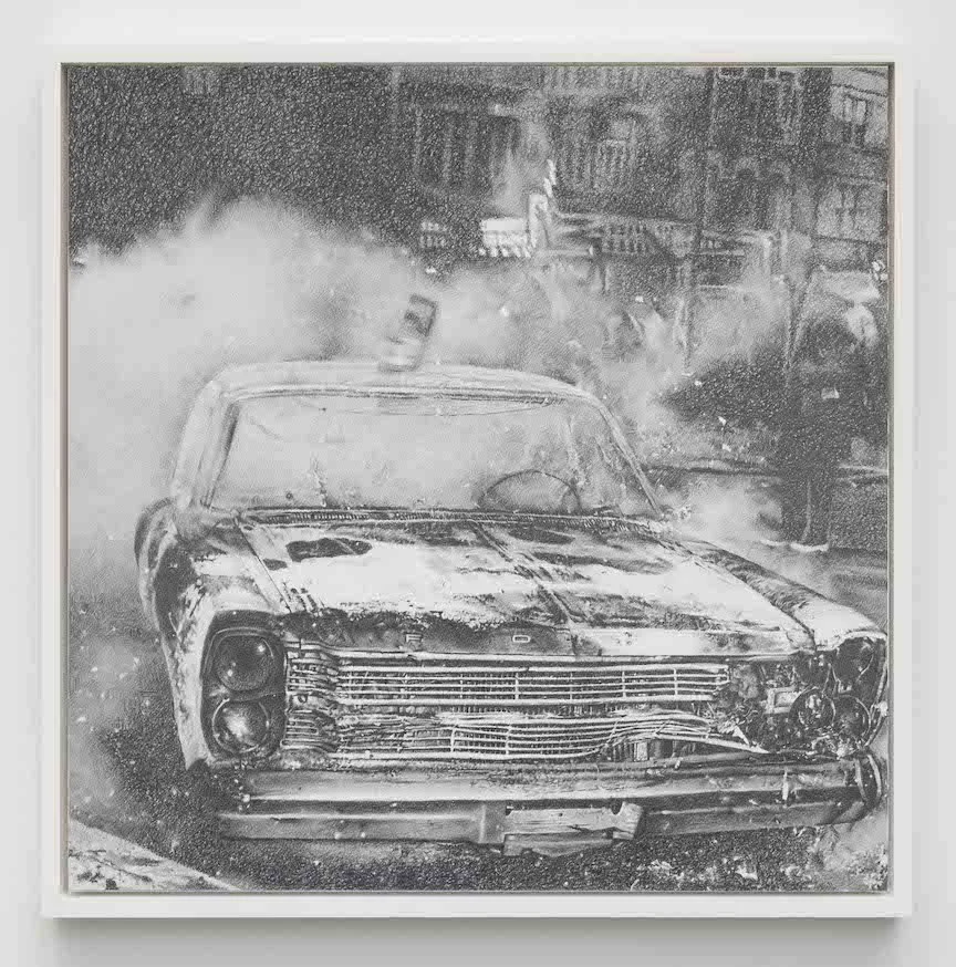 65GRAND is pleased to present The Division Street Riots, a new exhibition by Chicago-based artist Carlos Rolón. The exhibition features new graphite and charcoal drawings, works on aluminum, a DIY bicycle sculpture with audio, and a hand-embroidered textile inspired by the 1966 Division Street uprising in Humboldt Park and West Town.